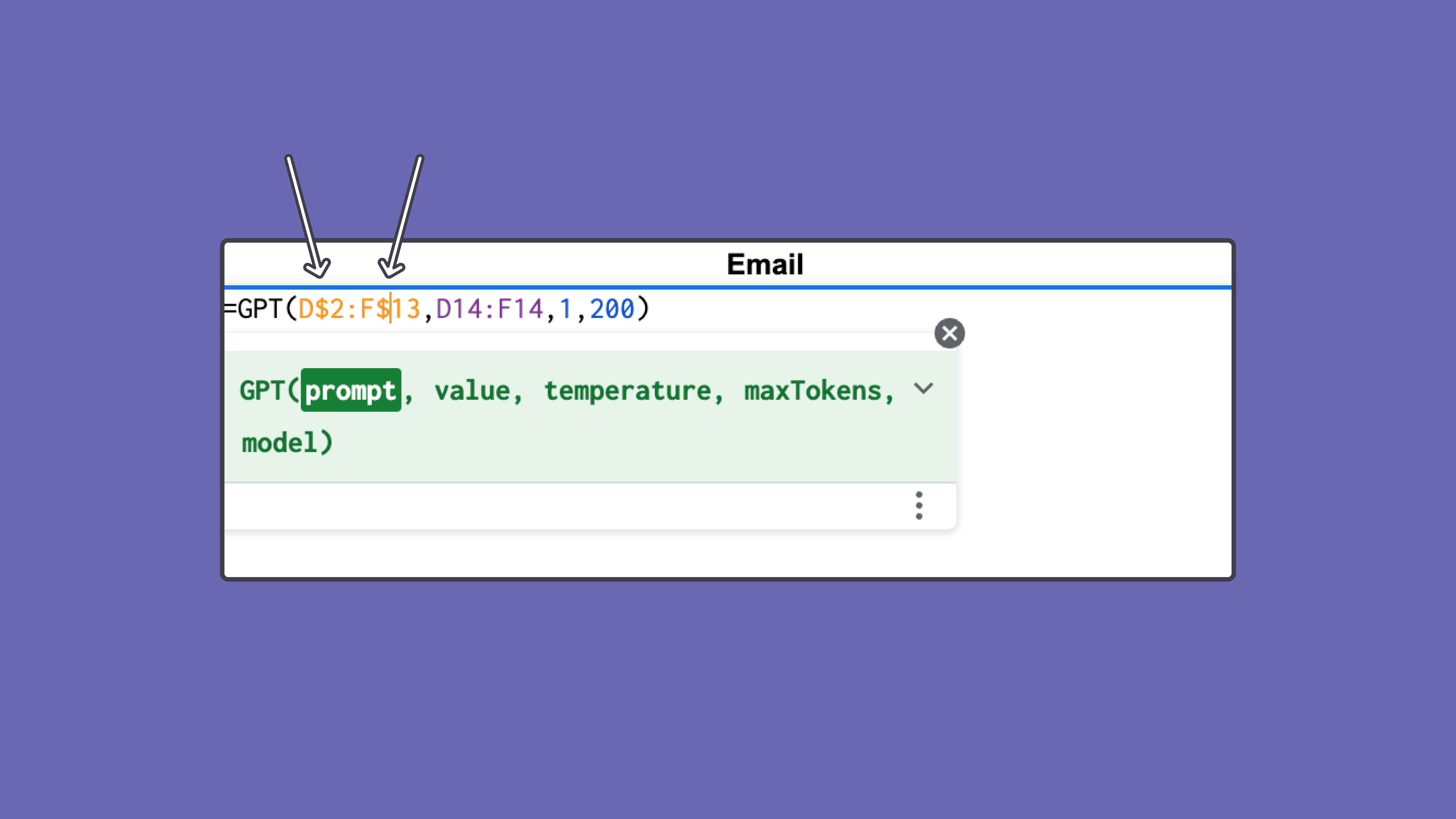 - Value – A spreadsheet cell you want your prompt to apply to – in our case, the name of website owners and personalization;